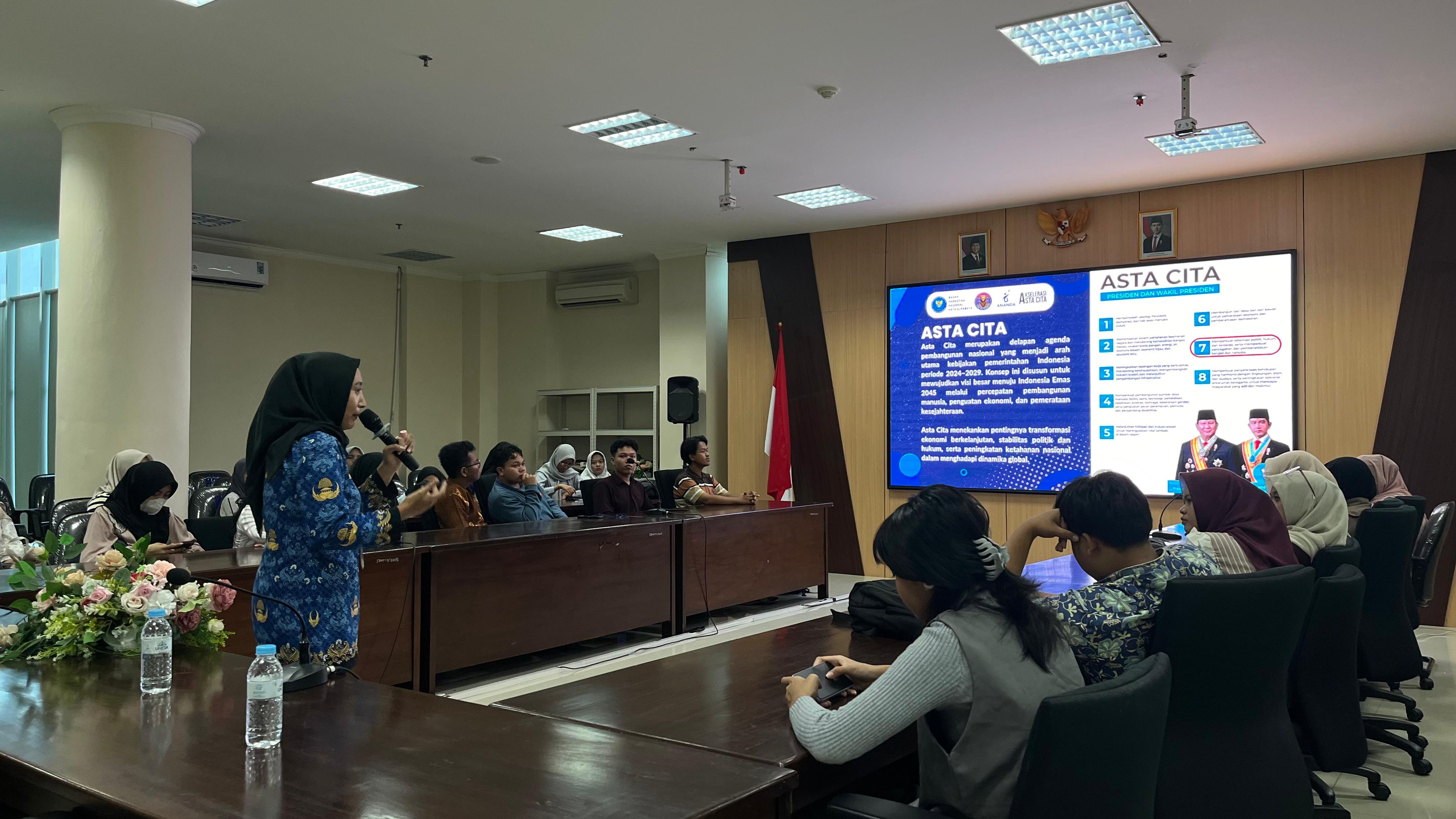 Sesi inti menghadirkan Novi Eka Afiana, S.I.Kom., Penyuluh Narkoba Ahli Pertama BNNK Surabaya, sebagai narasumber. Materi yang disampaikan mencakup gambaran umum ancaman narkoba di kalangan generasi muda, jenis-jenis narkoba yang marak beredar, serta dampak kesehatan, sosial, dan hukum yang ditimbulkan. Narasumber juga mengajak peserta untuk berani bersikap tegas menolak narkoba serta aktif menjadi agen perubahan di lingkungan sekitarnya.